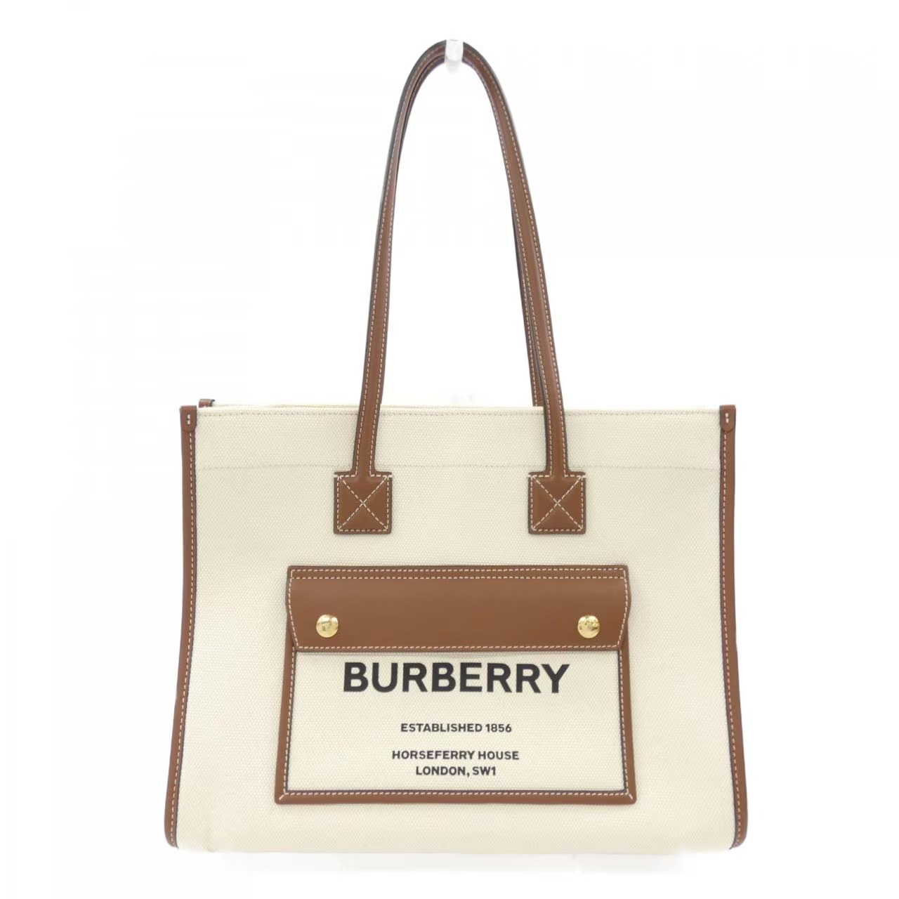 フレヤトートは2021年に登場したアイテム。カジュアルなキャンバス生地をメインにしながら、持ち手やフロントのポケットにレザー・金具などを使い、バーバリー(Burberry)らしいエレガントな仕上がりになっています。マチが広く収納力が高いところもポイントです。