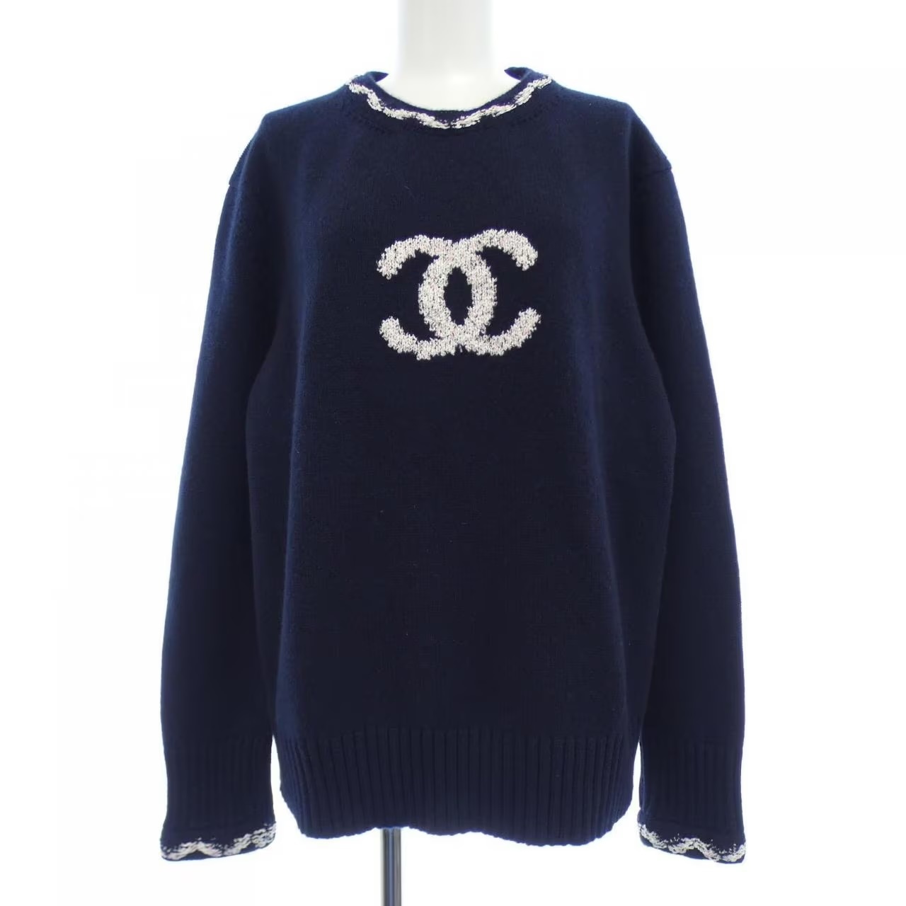紹介するのは、シャネルのアイコニックなロゴ「ココマーク」が大胆にあしらわれたニットです。ネイビー×ホワイトのシックな色使いなので、年齢問わず楽しめます。