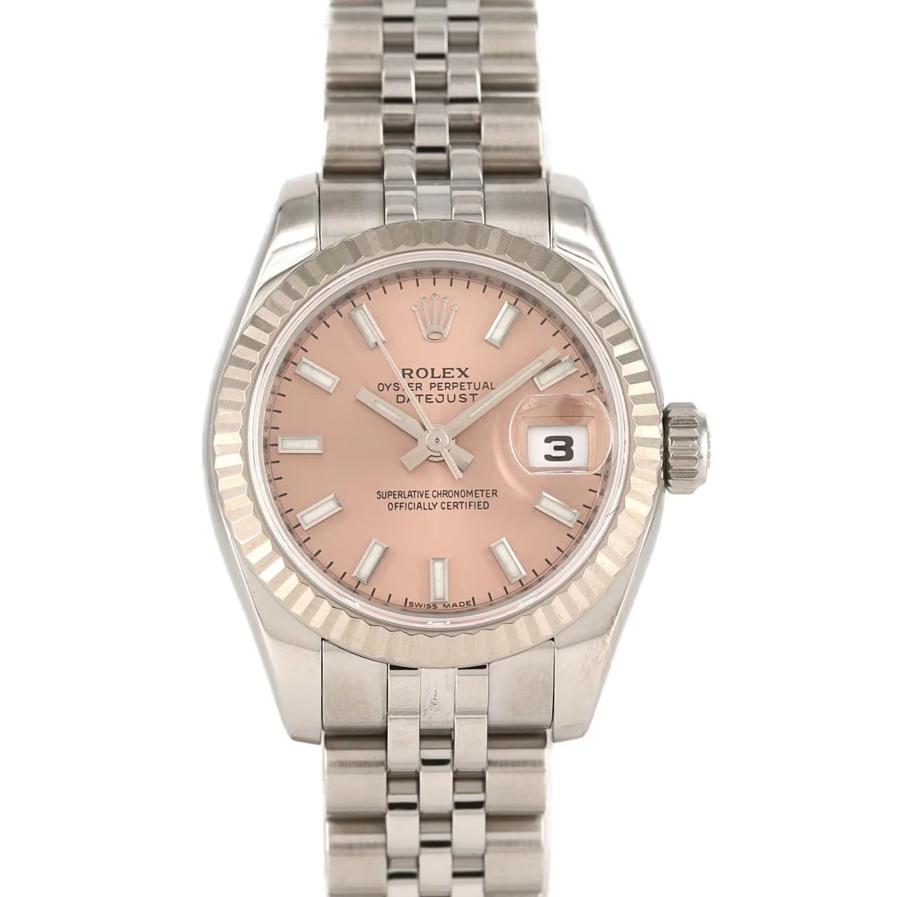 華やかで上品な時計を探している人におすすめしたい現行サイズのレディ デイトジャスト。エレガントなピンクの文字盤に散りばめられた10Pのダイヤモンドが優美にきらめきます。素材には18Kホワイトゴールドが使用され、ジュエリーのように身に着けられるのが魅力です。