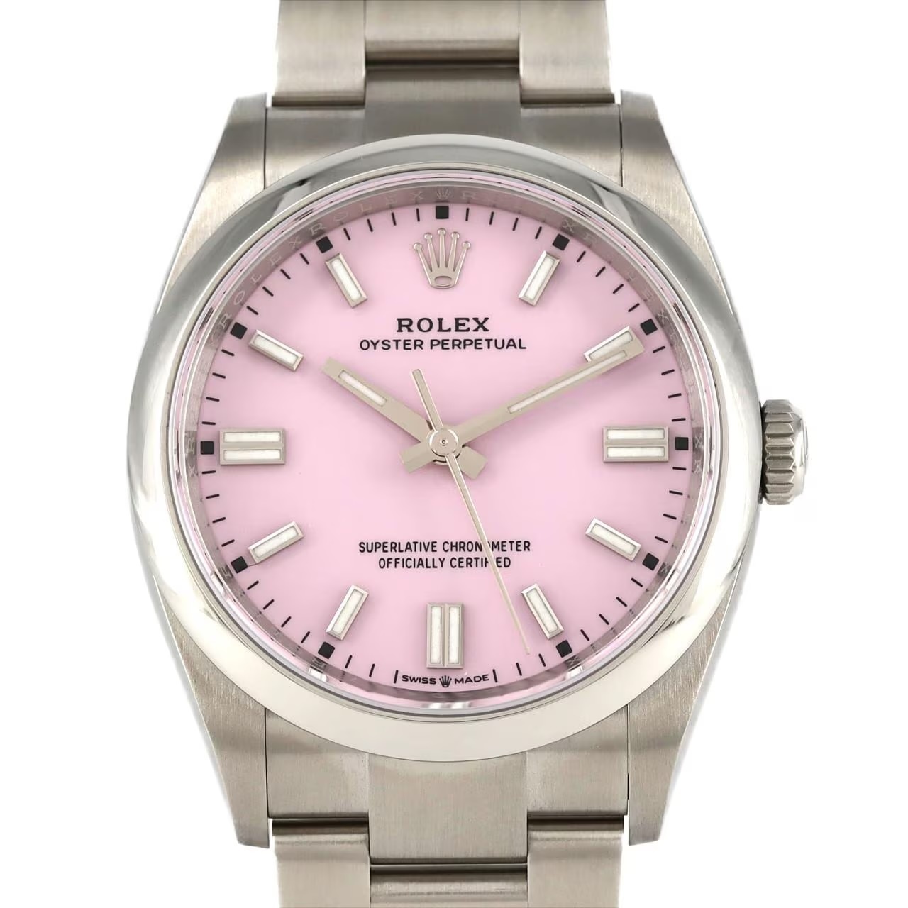 ロレックスを代表するスタンダードモデル「パーペチュアル」と、防水性のある「オイスターケース」を組み合わせたモデルが「オイスター パーペチュアル」です。日付表示を持たないため「ノンデイト」とも呼ばれ、すっきりとした文字盤デザインが特徴です。