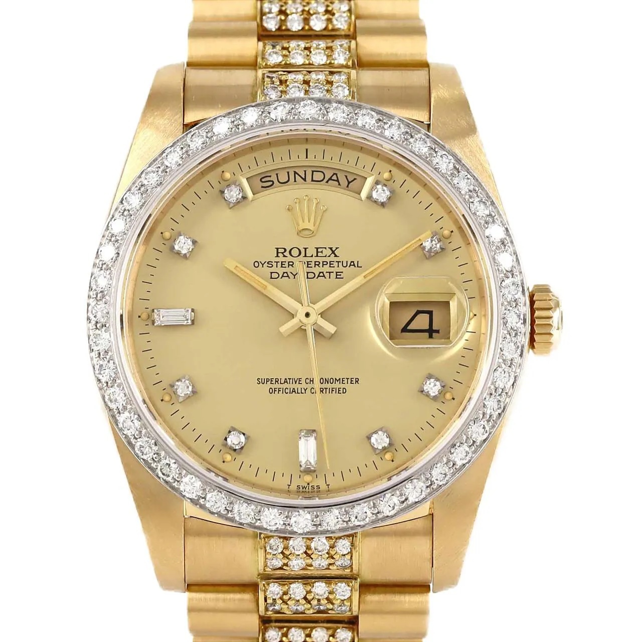 別名「プレジデントウォッチ」とも呼ばれる「デイデイト」。金やプラチナなどの貴金属のみを使用したエグゼクティブ向けの重厚感のあるモデルです。文字盤の上部に曜日表示があるのがデイトジャストとの大きな違いとなっています。36mm径は女性にも使いやすいサイズです。