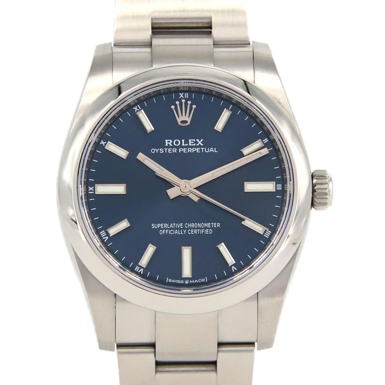 ユニセックスサイズのオイスターパーペチュアル。ネイビー文字盤が知的で落ち着いた印象を与え、ビジネスシーンにもふさわしいモデルです。