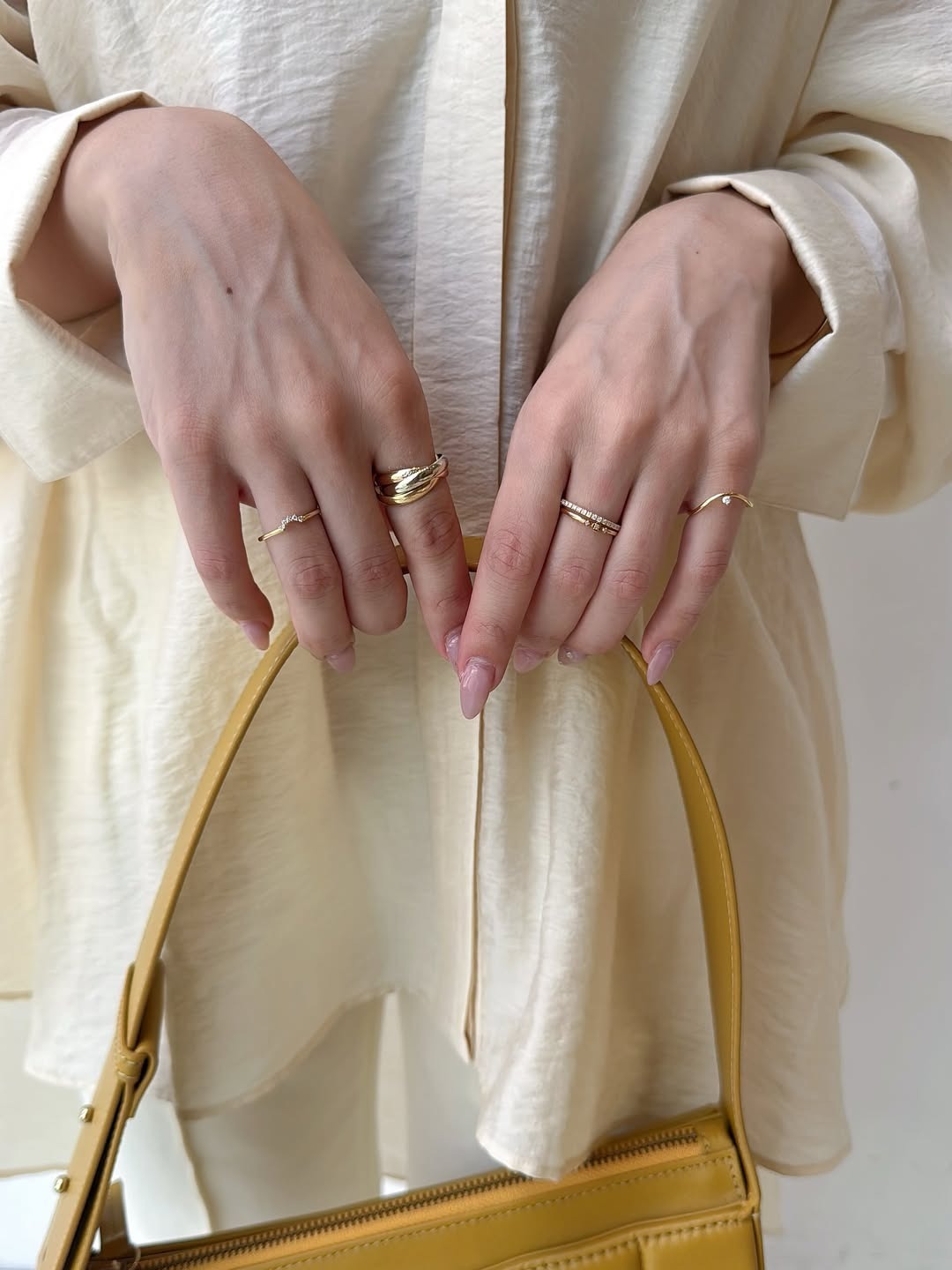 スモールリングはトリニティの中で最も幅が細く、華奢な印象のあるタイプです。手元を繊細に彩ってくれて、かつ他のリングとの重ね着けも楽しみやすいでしょう。