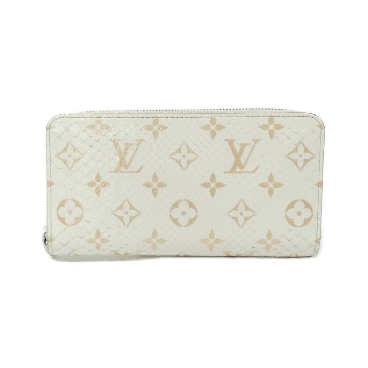 独特な風合いをもつパイソンレザーを使用した「モノグラム エキゾチック ジッピーウォレット」の長財布。お金を繁栄させると言われる蛇革、加えて白地に金色のモノグラムというカラーリングで大きな金運を期待できそうです。